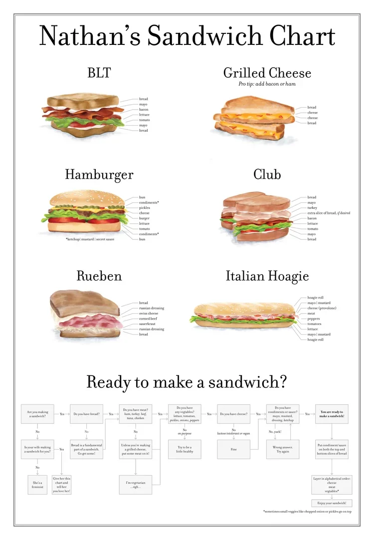 This custom illustrated poster was designed as a playful guide for friends to hang in their kitchen. If you’ve ever wondered how to layer your sandwich ingredients, this poster has you covered! Each sandwich is illustrated by me in Procreate using a digital watercolor style, then arranged into a clean, diagrammatic layout that shows the step-by-step layers. The result is both functional and fun—a piece of art that’s as informative as it is decorative.